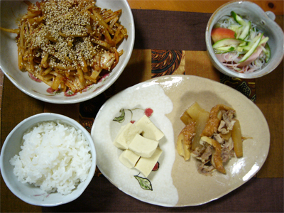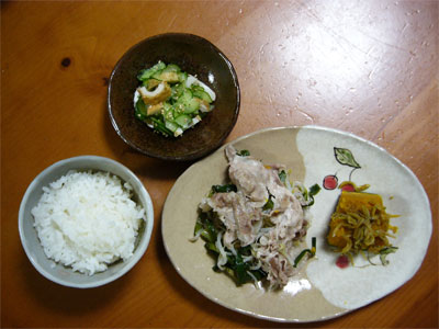 かぼちゃの煮物をまず最初に、次に豚もやし、これら煮物をしている間に酢の物を作ればばっちりです。